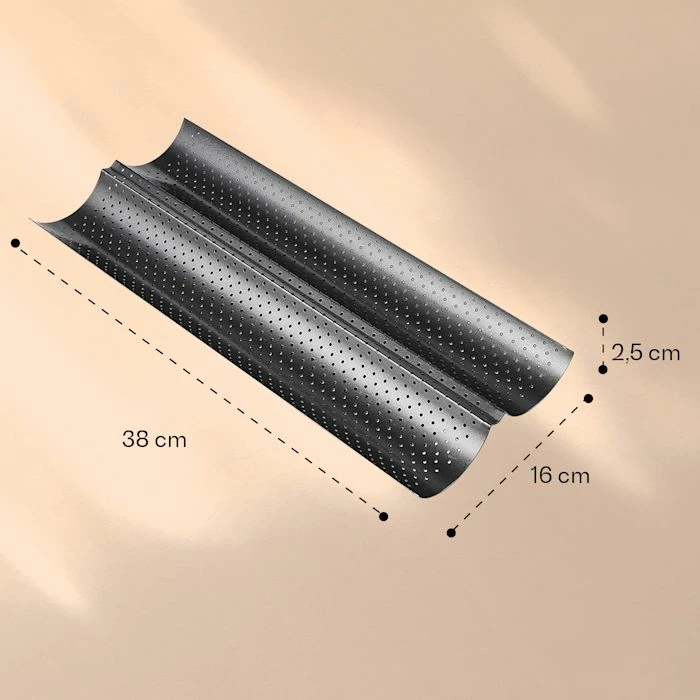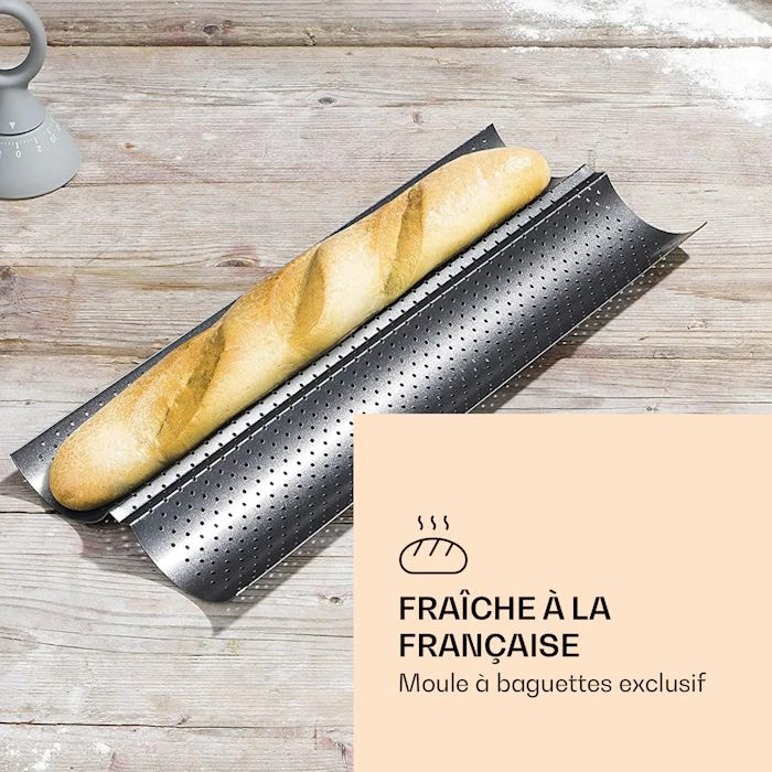 Le plaisir du pain le plus fin à la française : avec la plaque à baguette raffinée de Feelino by Klarstein, vous pouvez dès maintenant cuire vous-même de délicieuses baguettes de pain blanc tout juste sorties du four. La plaque pâtissière est formée de plusieurs creux dans lesquels la pâte à pain s’incurve pendant la cuisson pour former la baguette originale. Fabriqué en acier au carbone de haute qualité, le moule à baguette vous offre de nombreux avantages : il dispose d’un bon revêtement anti-adhésif, convient aux aliments et est facile à nettoyer. De plus, la plaque à pain est équipée d’une perforation spéciale qui assure une répartition optimale de la chaleur et donc des résultats de cuisson très uniformes. Cela confère également à votre baguette fraîche une croûte uniformément brune et croustillante. Grâce aux creux préformées de la plaque à baguettes, vous pouvez préparer plusieurs baguettes fraîches et croustillantes à la fois.