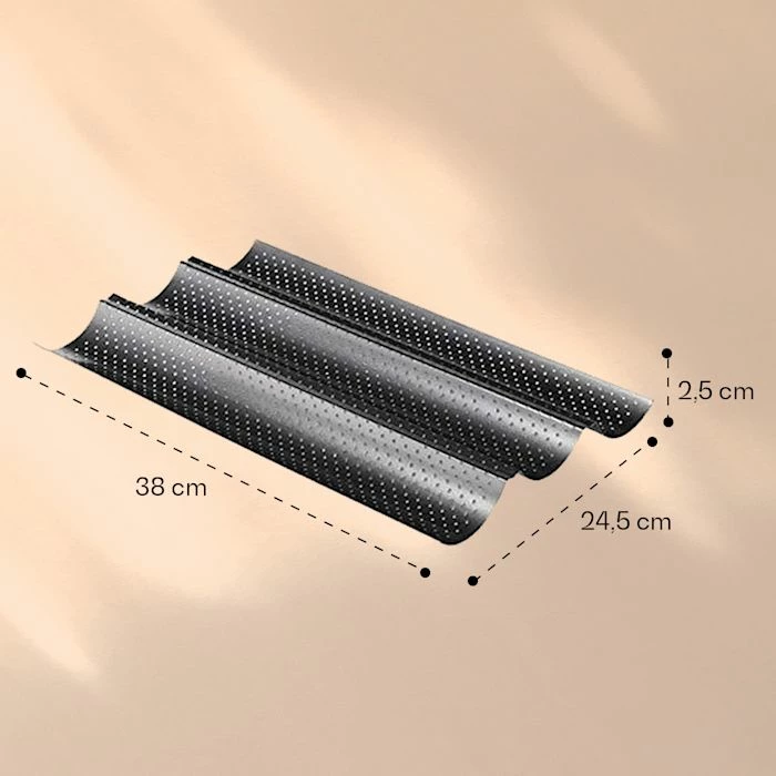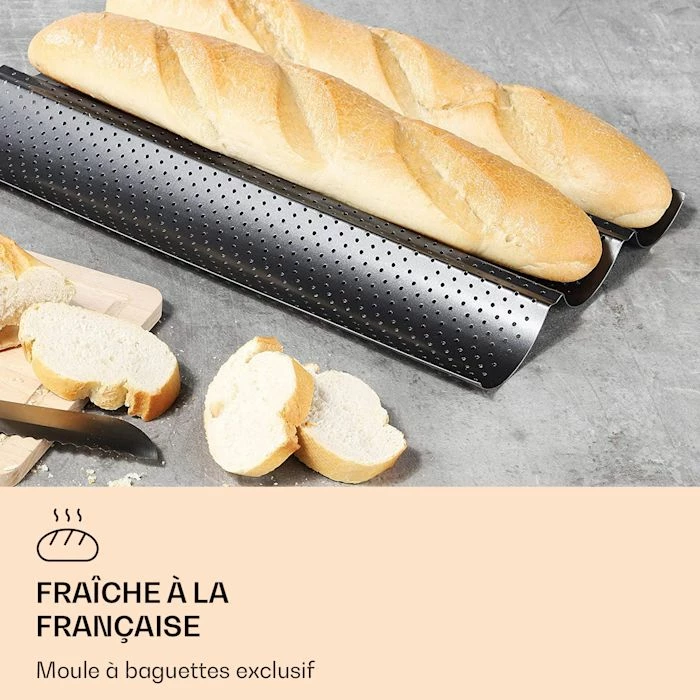 Le plaisir du pain le plus fin à la française : avec la plaque à baguette raffinée de Feelino by Klarstein, vous pouvez dès maintenant cuire vous-même de délicieuses baguettes de pain blanc tout juste sorties du four. La plaque pâtissière est formée de plusieurs creux dans lesquels la pâte à pain s’incurve pendant la cuisson pour former la baguette originale. Fabriqué en acier au carbone de haute qualité, le moule à baguette vous offre de nombreux avantages : il dispose d’un bon revêtement anti-adhésif, convient aux aliments et est facile à nettoyer. De plus, la plaque à pain est équipée d’une perforation spéciale qui assure une répartition optimale de la chaleur et donc des résultats de cuisson très uniformes. Cela confère également à votre baguette fraîche une croûte uniformément brune et croustillante. Grâce aux creux préformées de la plaque à baguettes, vous pouvez préparer plusieurs baguettes fraîches et croustillantes à la fois.