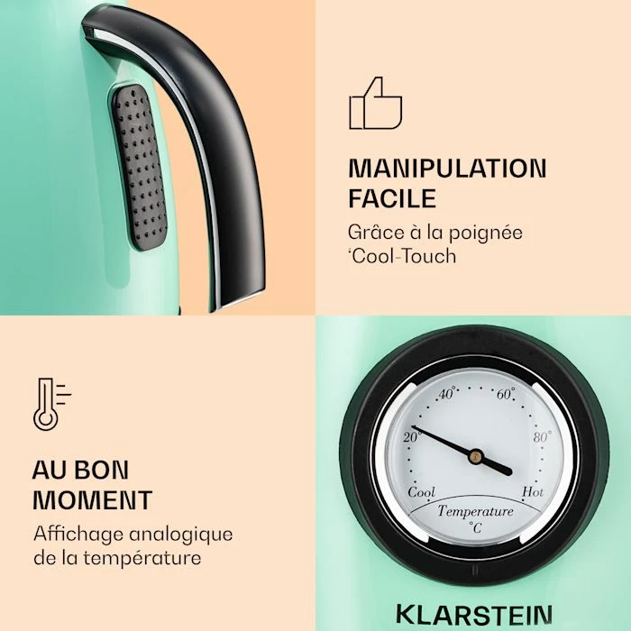 La Bouilloire Klarstein Aquavita Chalet porte rapidement et facilement l’eau à ébullition. Grâce à l’affichage latéral de la température, vous pouvez suivre le processus d’ébullition en temps réel et choisir le moment idéal pour obtenir la température d’infusion parfaite. De plus, la bouilloire est équipée d’une poignée Cool-Touch, ce qui permet de déplacer facilement les produits chauds de la station d’accueil à l’endroit souhaité.