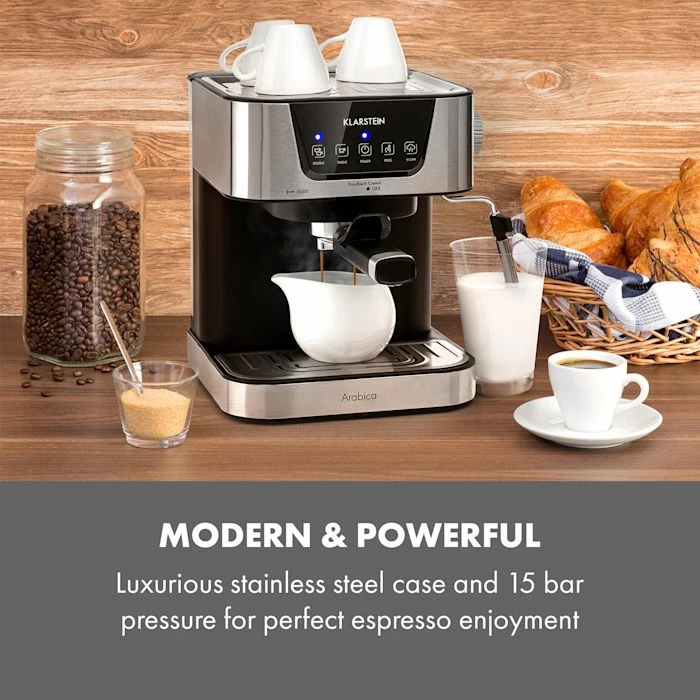 La machine à espresso Klarstein Arabica offre un plaisir sophistiqué pour tous les sens : elle prépare un espresso intense et corsé et attire tous les regards dans la cuisine.