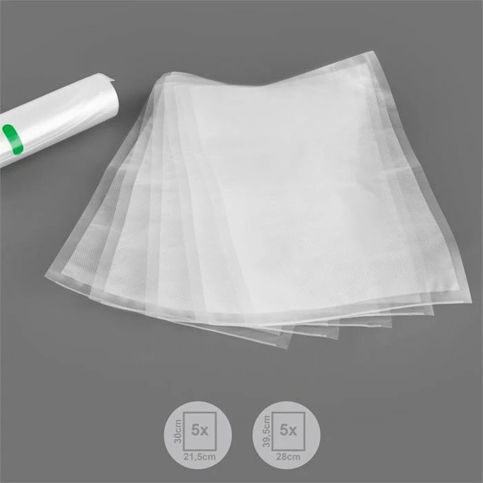 - 5 petits (30 x 21,5 cm) et 5 grands (39,5 x 28 cm) sacs hermétiques inclus
