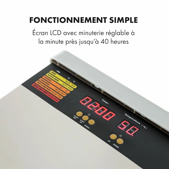 - Pour les professionnels : déshydrateur alimentaire avec 630 watts et jusqu’à 68 ° C