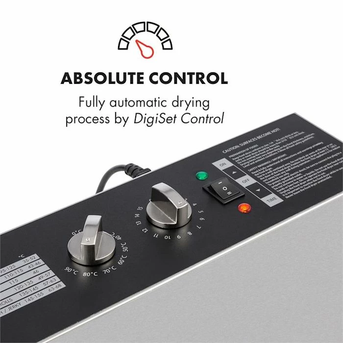 Avec son énorme rendement calorifique de 1500 watts et sa répartition homogène de la chaleur, le déshydrateur Master Jerky 16 assure un séchage optimal des aliments, tout en réduisant le temps de déshydratation. Pour la préparation polyvalente des aliments les plus différents, la température peut être réglée en continu de 40 à 90 °C, et une minuterie jusqu’à 15 heures garantit le meilleur ajustement possible à l’aliment à déshydrater. Avec le processus de déshydratation entièrement automatique et le maintien de la température exacte avec DigiSet Control, vous pouvez parvenir à tout. Grâce au concept NutritionPlus, d’importants minéraux et vitamines sont conservés et le goût est intensifié. Ainsi, les aliments séchés contiennent jusqu’à 4 fois plus d’éléments nutritifs que la même quantité d’aliments frais.