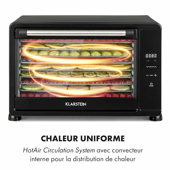 - Séchage efficace : élément chauffant en acier inoxydable de 650 watts pour des températures de 50 à 80 °C