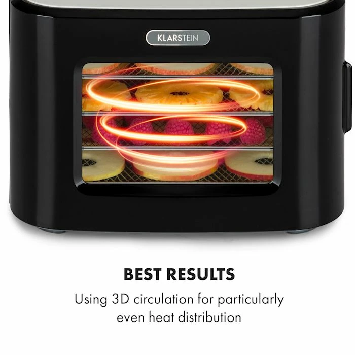Le déshydrateur compact et élégant Klarstein Tutti Frutti déshydrate en un temps record les fruits, mais aussi les légumes, la viande et d’autres aliments, pour produire des collations et ingrédients délicieux et durables. Le Tutti Frutti a le bon réglage de température et de temps prêt pour tous les goûts : pour les fruits secs riches en vitamines comme les pommes et les chips de banane ou les légumes sains comme les tomates séchées.