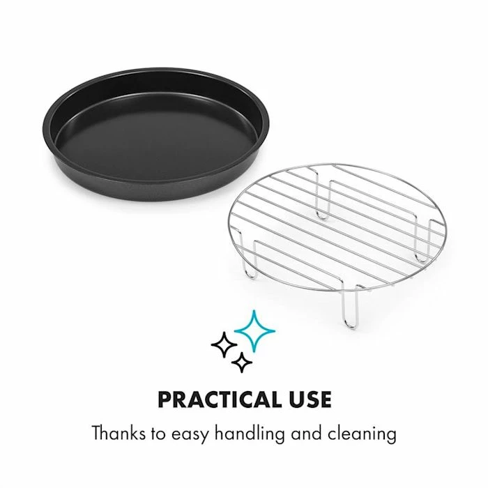 La plaque à pizza Klarstein avec niveau de gril porte la friteuse à air chaud AeroVital Cube Chef à un nouveau niveau de préparation pour des pizzas croustillantes, omelettes aérées et délicieuses poêlées de légumes ou d’œufs au plat. L’insert de gril servir de niveau de gril supplémentaire pour la viande, le poisson et les légumes ou comme support métallique pratique pour la plaque à pizza.