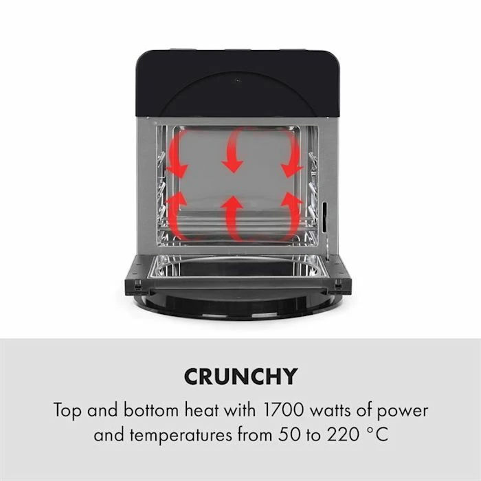 - Croustillant : chaleur de voûte et de sole avec une puissance de 1700 watts et des températures entre 50 et 220 °C