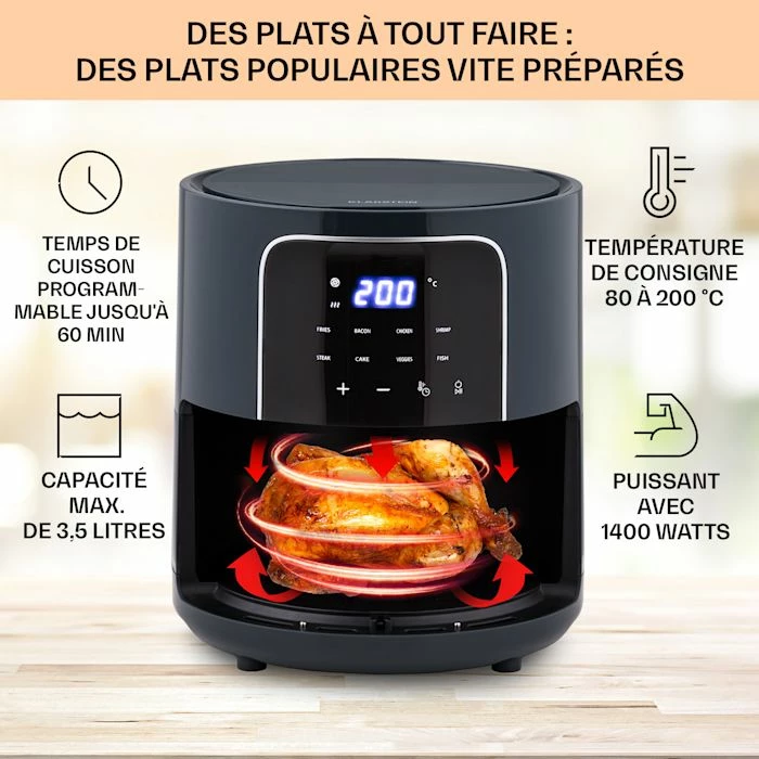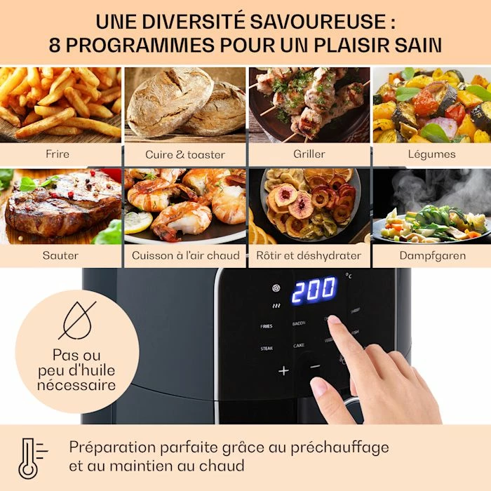 - 8 programmes de cuisson : Préréglages pour frites, poisson, steaks, légumes, etc.
