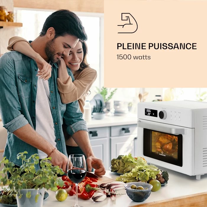 Une friture saine et délicieuse : Avec la friteuse à air chaudKlarstein Prime Air, réussissez vos frites croustillantes et pas seulement. 8 programmes sélectionnables vous offrent un choix extra large pour la préparation de snacks et de plats au mini-four. Le secret de la Prime Air réside dans son système de chauffage de 1500 watts qui permet de frire, cuire, griller ou rôtir avec une chaleur de voûte, de sole et de convection. Avec sa capacité de 23 litres, le grand espace intérieur ne laisse pratiquement rien à désirer en matière de préparation et peut même contenir un poulet grillé entier. En même temps, la friteuse à air chaud Klarstein Prime Air est particulièrement compacte grâce à son design de mini-four et ne prend pas plus de place sur le plan de travail qu’une friteuse traditionnelle ! Le vaste jeu d’accessoires est parfaitement adapté à toutes les utilisations.