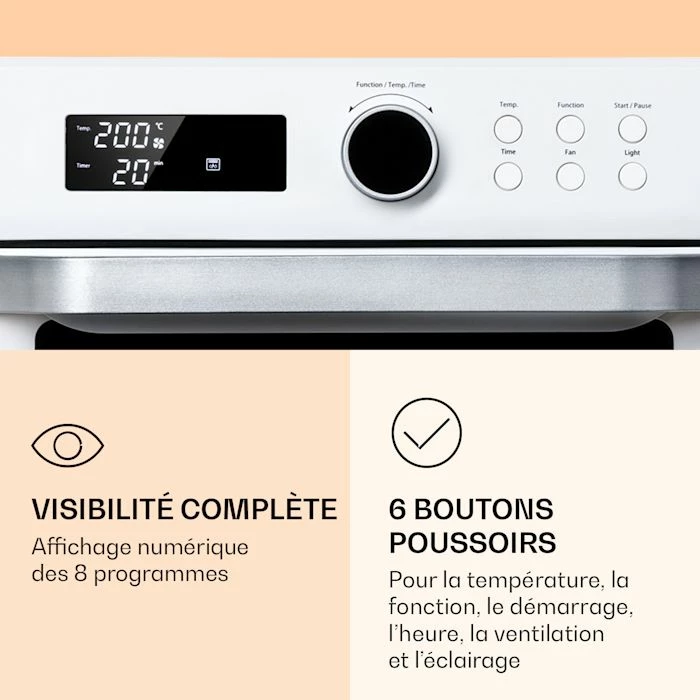 - 8 programmes : Friture à air chaud, Friture à air chaud & tournebroche, Chaleur de voûte, Chaleur de sole, Chaleur de voûte et de sole, Fermentation , Décongélation, Maintien au chaud