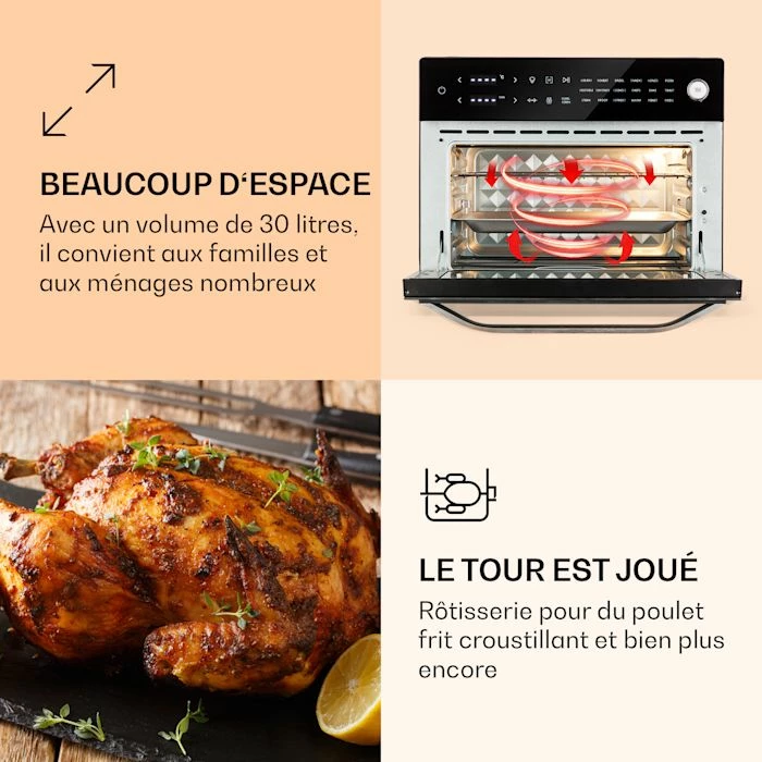 - Complet : grille, panier à friture, plaque de cuisson, tournebroche et poignée de tournebroche