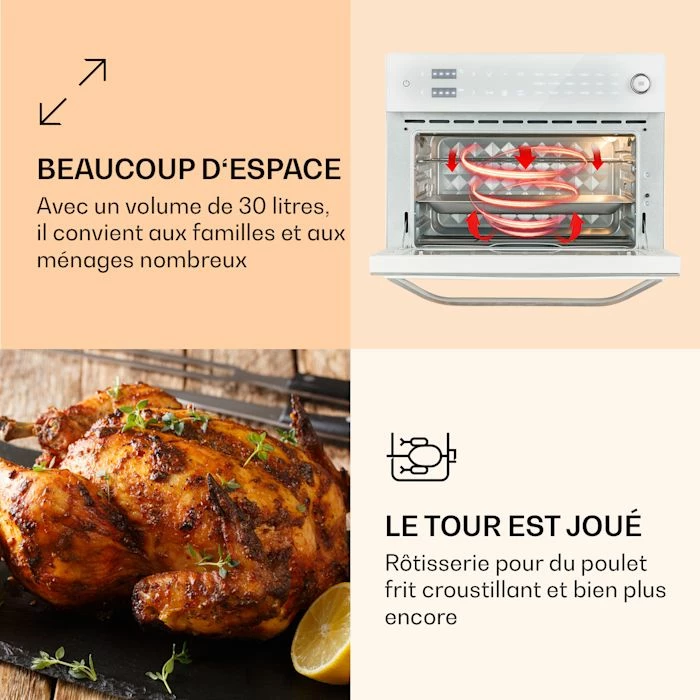 - Complet : grille, panier à friture, plaque de cuisson, tournebroche et poignée de tournebroche