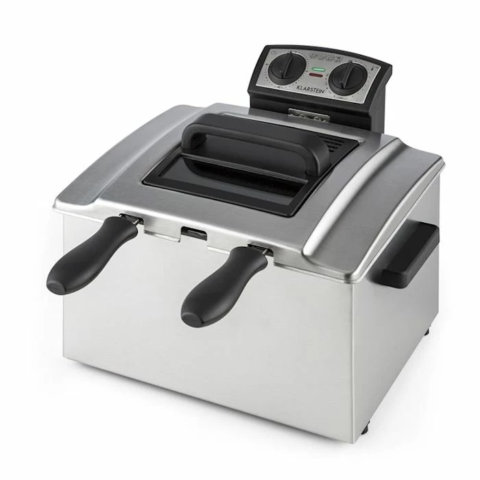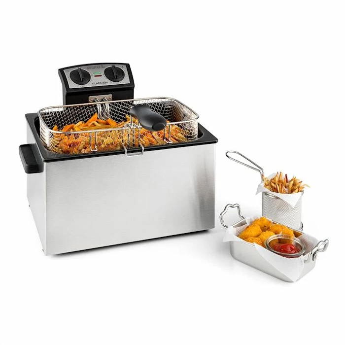 Avec la QuickPro XXL 3000, Klarstein présente une friteuse pratique répondant à toutes les exigences de la friture. Grâce à son élément chauffant de 3000 W puissant et réglable progressivement, cette friteuse transforme de banals morceaux de pomme de terre en frites croustillantes, ou encore des morceaux de poisson froid en bâtonnets de poisson chauds. La cuve possède un volume de 5 litres et convient donc particulièrement à la cuisson en grandes quantités. Jusqu’à 1,5 kg d’aliments peuvent être frits en une fois, pratique pour les grandes familles, les colocs étudiantes ou une utilisation en catering ou dans un bar. Les différents paniers à friture du QuickPro XXL 3000 renforcent cette polyvalence : vous disposez au choix d’un grand et de 2 petits paniers, parfait pour préparer de grandes quantités en une fois ou bien deux aliments différents en même temps.