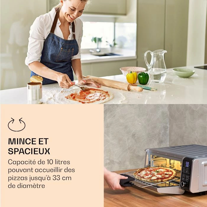 - Mince et spacieux : Capacité de 10 litres pour des pizzas jusqu’à 33 cm de diamètre