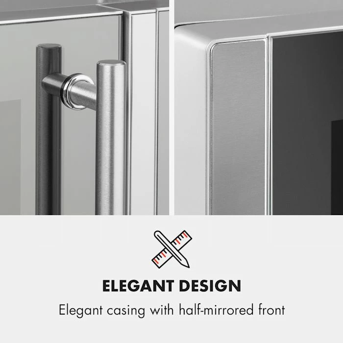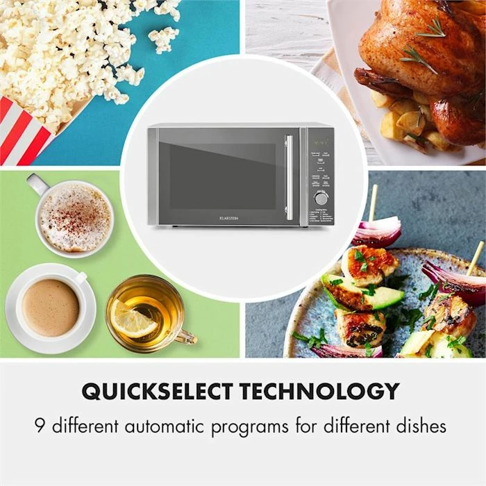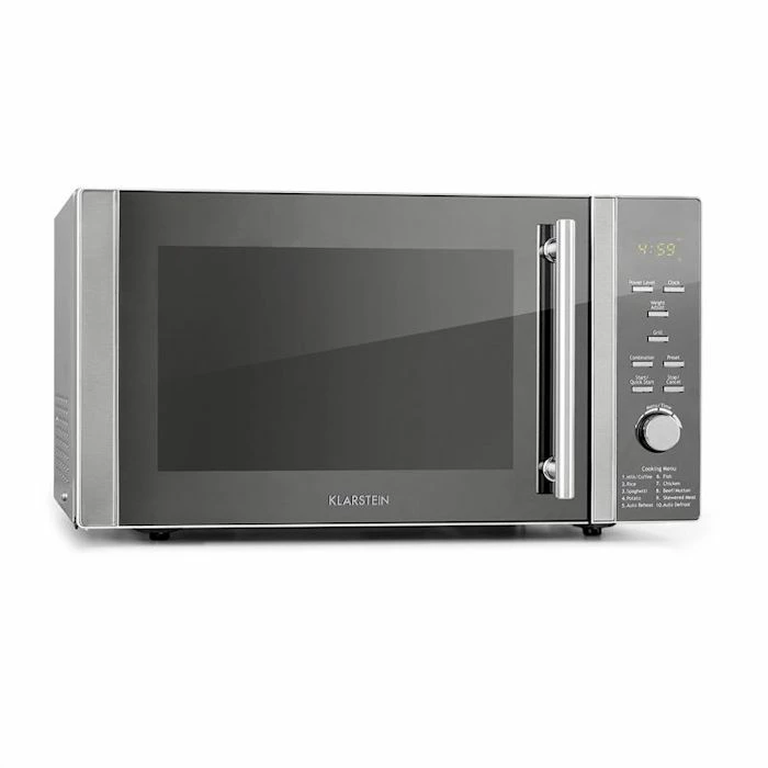 Le micro-ondes Klarstein Luminance Prime 34L est désormais indispensable à de nombreux ménages grâce à sa performance, ses riches fonctionnalités et son design élégant, et il réunit micro-ondes et gril dans un appareil multifonction. Sa puissance micro-ondes de 1000 W et ses 34 litres de capacité font que cet appareil est parfaitement adapté aux besoins de notre rythme de vie moderne toujours rapide : avec la technologie QuickSelect vous pouvez facilement choisir l’un des 9 programmes automatiques avec les touches commande et l’écran LED associé pour réchauffer rapidement des repas préparés, cuisiner des plats ou garder au chaud les aliments cuits. Pour obtenir les meilleurs résultats sur le plateau de verre de Ø 32,5 cm, réglez le temps de cuisson de façon pratique grâce aux 11 niveaux de puissance. Lorsque la durée est écoulée, le micro-ondes s’arrête et émet un bip pour attirer l’attention. Ainsi, les aliments préparés ne sont pas oubliés et les estomacs qui grondent sont remplis dans les temps. En outre, le Luminance Prime 34L possède un gril de 1300 W qui garantit aux pizzas, soufflés et autres brochettes de viande le bon croustillant avec la grille de cuisson fournie : réglez simplement la fonction du programme et le temps de cuisson désiré et savourez le plaisir des grésillements de cuisson ! Le gril peut fonctionner en même temps que le micro-ondes grâce à deux fonctions de combinaison prédéfinies. Pour décongeler les aliments surgelés, le micro-ondes Klarstein offre aussi une fonction décongélation sans risque de cuire les viandes, volailles ou fruits de mer, . Le micro-ondes Luminance Prime 34L porte également très bien son nom vu de l’extérieur avec son design élégant et sa façade semi-réfléchissante qui se fondra dans tout ensemble de cuisine moderne ou classique.