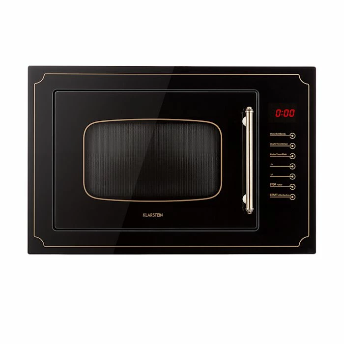 Le micro ondes à encastrer Klarstein Victoria 25 avec son cadre de montage fourni est un puissant multi talent pour les célibataires et les ménages qui réunit en un seul appareil multifonction le micro ondes et le grill. Le micro ondes de 900 W et son volume de cuisson de 25 litres en font un appareil parfaitement adapté aux exigences de notre époque où nous sommes toujours pressés : avec la technologie QuickSelect vous pouvez facilement régler l’un des 8 programmes automatiques sur le panneau de commande tactile pour réchauffer le plus rapidement possible des repas préparés, cuire des plats ou maintenir au chaud des plats déjà prêts. Pour obtenir des résultats parfaits sur le plateau de verre de Ø 31,5 cm, vous pouvez en plus des programmes régler la durée de cuisson facilement. La durée écoulée, le micro ondes à encastrer s’arrête et se signale à vous par un bip sonore. De cette façon, les plats préparés ne seront pas oubliés et les estomacs grognons seront remplis dans les temps. De plus, le Victoria 25 possède un grill de 1000 W qui apporte grâce à sa grille de cuisson fournie l’aspect idéalement grillé à vos saucisses et viandes, le plus rapidement qui soit : sélectionnez tout simplement la fonction programme ainsi que la durée de cuisson et profitez du plaisir des grésillements ! Avec ses deux fonctions combinées pré réglées, le grill peut aussi fonctionner en même temps que le micro-ondes. Pour décongeler les aliments surgelés, le micro ondes à encastrer Klarstein offre en plus une fonction décongélation qui rend aussi facile qu’un jeu d’enfant la décongélation de la viande, des volailles ou des fruits de mer, sans risque de les cuire involontairement. A l’intérieur de l’appareil scintille un intérieur SimpleClean en acier inoxydable, particulièrement résistant et facile à nettoyer. Le micro-ondes à encastrer Victoria 25 fait également honneur à son nom de l’extérieur car il dispose d’un élégant boîtier rétro style 19 ème siècle qui se fondra dans n’importe quel style de cuisine moderne ou classique.