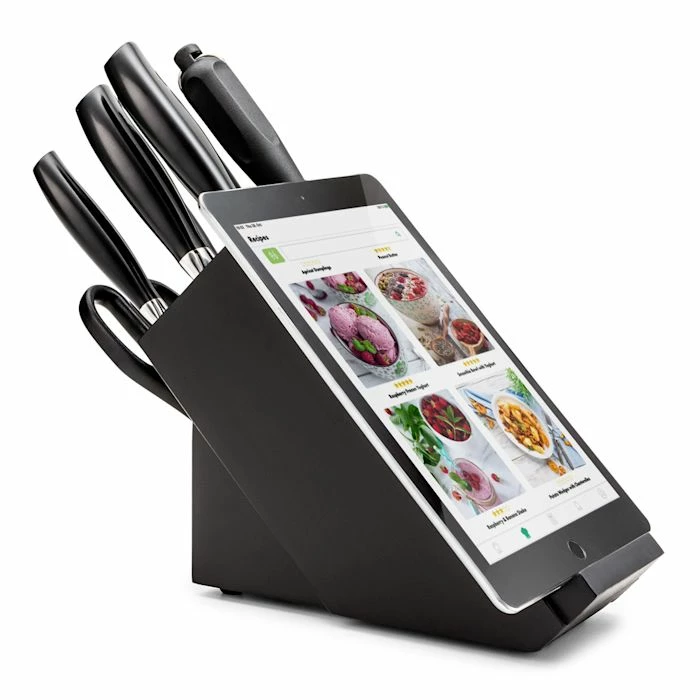 - Cuisiner selon une recette : bloc à couteaux avec fonction de support pour iPad