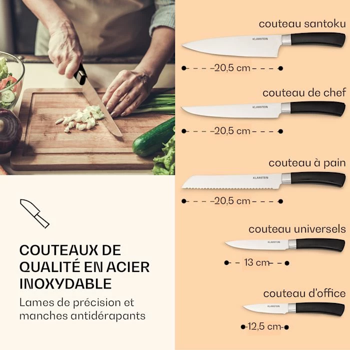- Couteaux de qualité en acier inoxydable : lames de précision et poignées antidérapantes