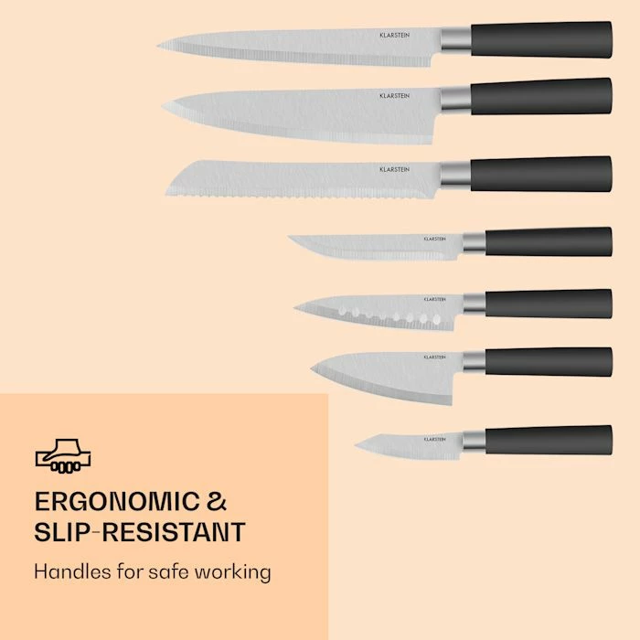 Pour profiter au maximum des ingrédients frais, il faut le bon couteau. Pour cela, le bloc de couteaux Kitano de Klarstein contient 7 modèles avec différentes lames de précision en acier trempé. Grâce à leur forme ergonomique et à leur matériau antidérapant, les couteaux tiennent bien en main.