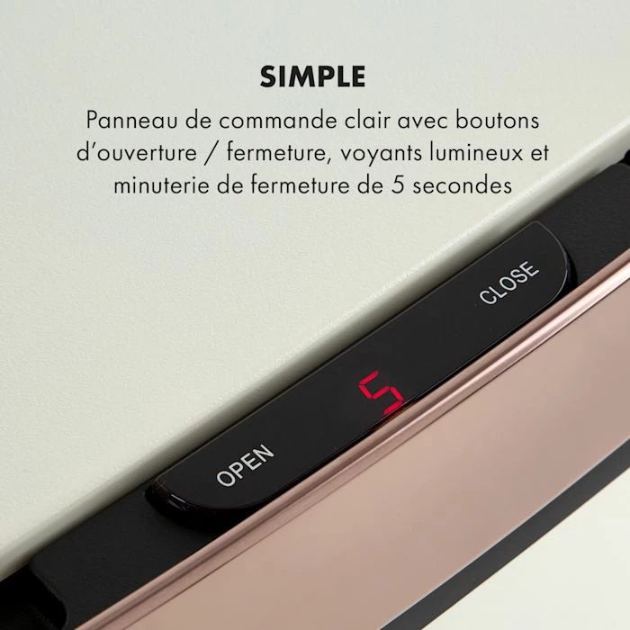 - Simple : panneau de commande clair avec boutons d’ouverture / fermeture, voyants lumineux et minuterie de fermeture de 5 secondes