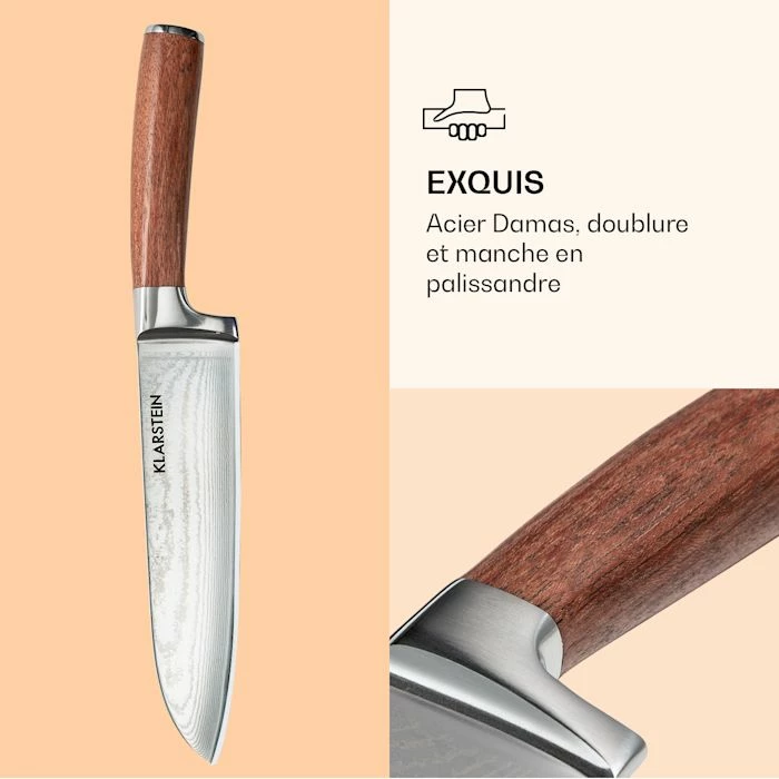 - Excellente finition : acier damassé, double sous-couche et manche en bois de rose.