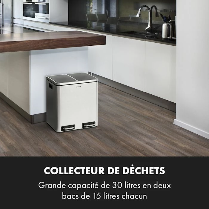 - Collecteur de déchets : grande capacité de 30 litres en deux bacs de chacun 15 litres