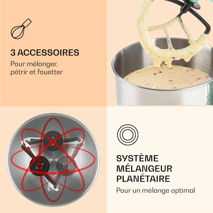 - 3 accessoires : pour mélanger, pétrir et fouetter.