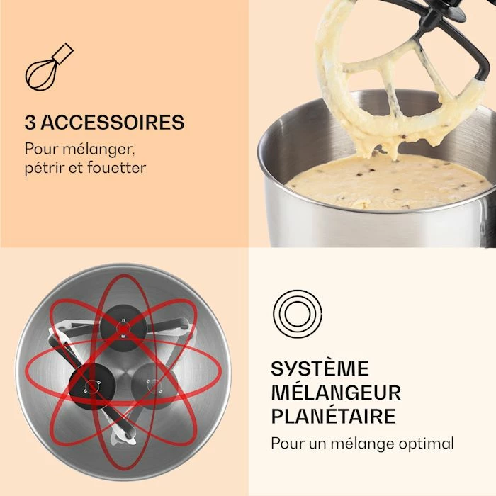 - 3 accessoires : pour mélanger, pétrir et fouetter.