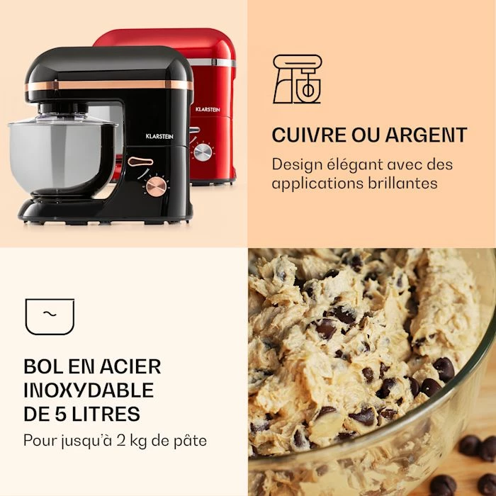 Élégant jusqu’au dernier tour et incroyablement fort en même temps. Il est très facile de s’attaquer à la cuisine avec style avec les robots de cuisine Klarstein Bella Elegance. Avec 2000 watts de puissance et 6 vitesses, notre système mélangeur planétaire répond à tous les défis de l’art du mélange moderne. Que ce soit de la pâte à pain, de la crème fouettée ou du gâteau marbré : dans le bol en acier inoxydable de 5,2 litres, mélangez tout parfaitement grâce à ses 3 crochets mélangeurs. Le design coloré de votre nouvelle Bella Elegance est également un point fort avec des applications en cuivre ou en argent pour plus d’éclat. Il reste ainsi la star de votre cuisine, même après usage !