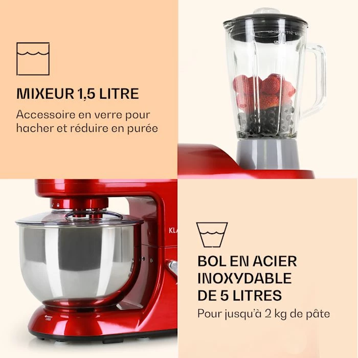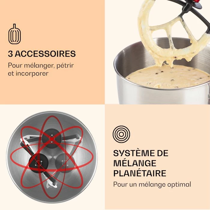 - 3 accessoires : pour mélanger, pétrir et mixer.