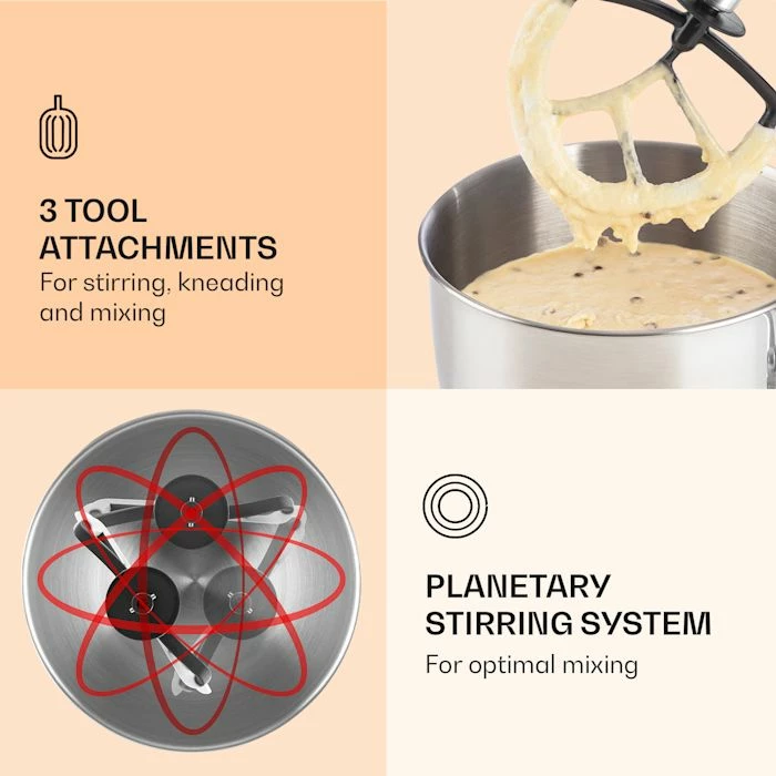 - 3 accessoires : pour mélanger, pétrir et fouetter.