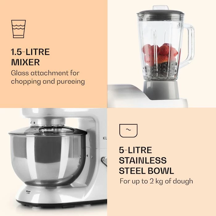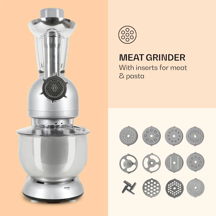 Le Klarstein Lucia Argentea est un robot de cuisine omnipotent qui est composé d’une machine à pétrir et mélanger, d’un hachoir et d’un mixeur.