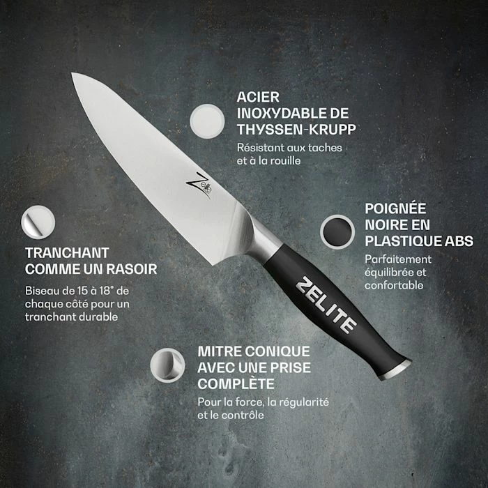 - Lame de 6″ : Couteau de chef pour hacher et couper avec précision tous les ingrédients