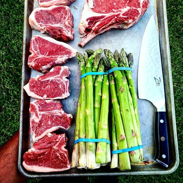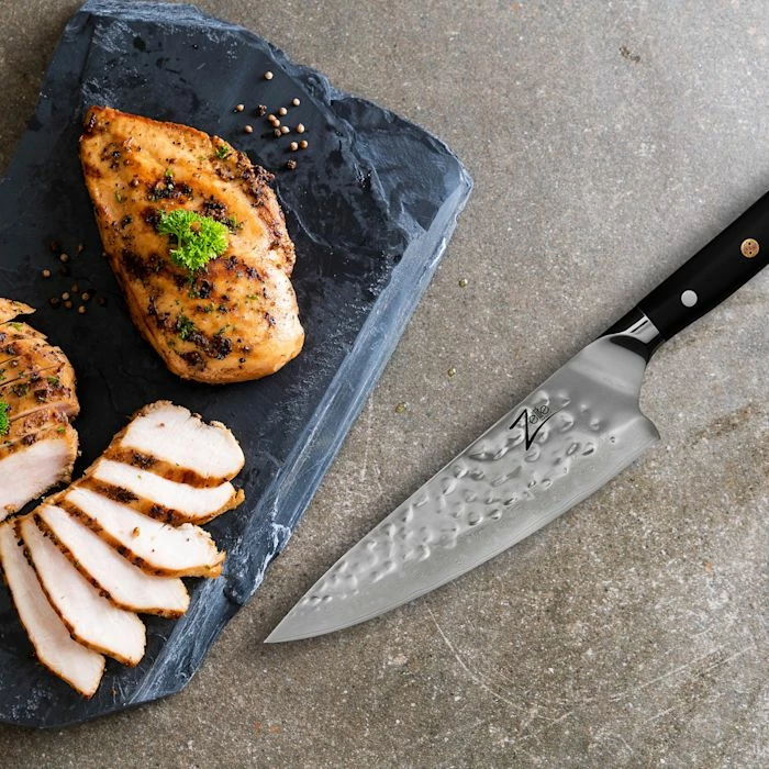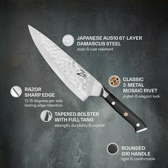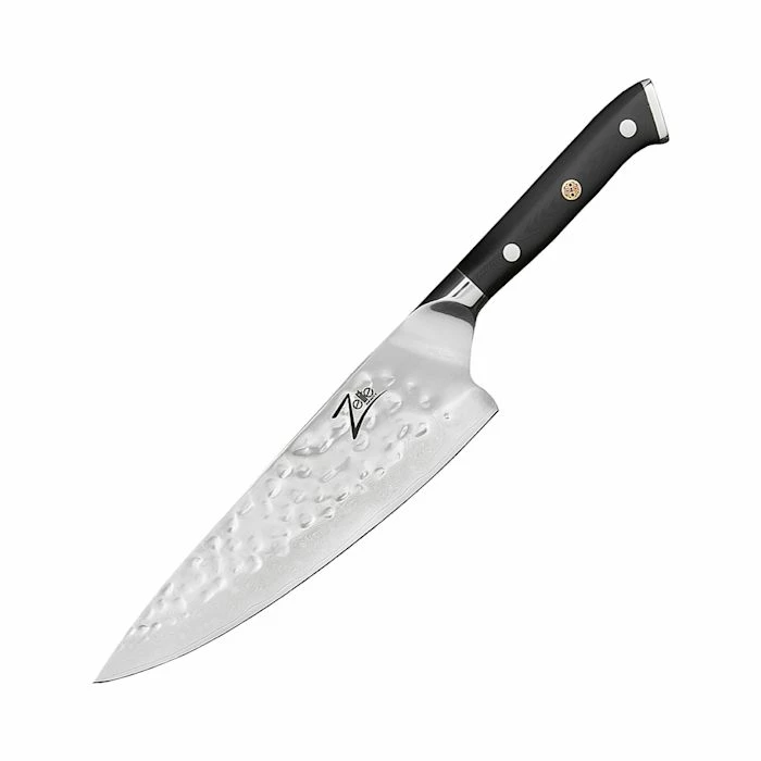 - Lame de 8″ : grand couteau de chef pour hacher, couper en dés et couper