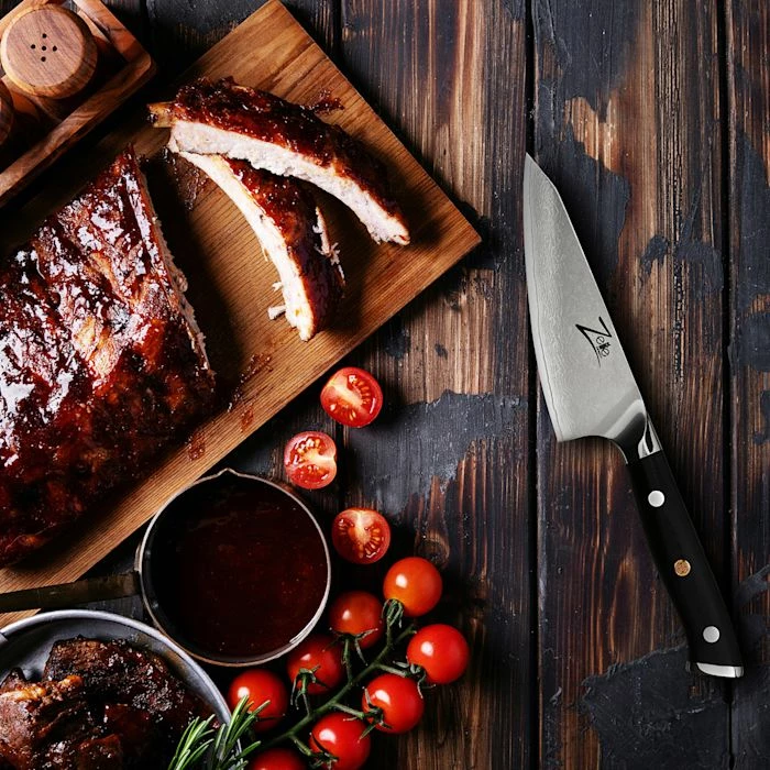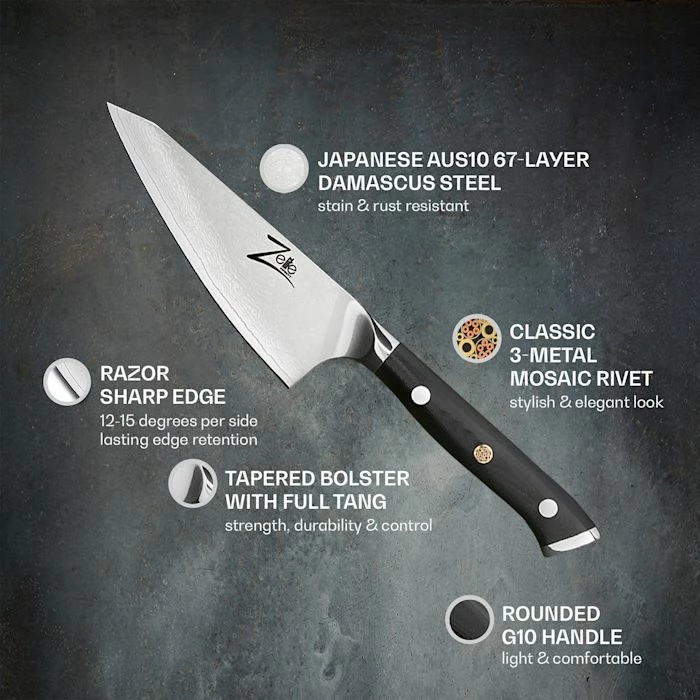 Couteaux de précision exclusifs de style japonais : la série de couteaux japonais Alpha-Royal Zelite Infinty de Klarstein affûtés à la main répond à des normes élevées pour chaque art culinaire. Un total de 67 couches superposées d’acier Damas japonais de haute qualité forment la lame irisée. Avec une forme parfaitement équilibrée et ergonomique et un manche sans soudure à triple rivetage en fibre de verre G10, ces élégants outils de cuisine tiennent merveilleusement bien en main. Ici, le tranchant, la durabilité, le poids, le contrôle et la maniabilité se combinent à un design exceptionnel, perfectionné par une mosaïque de 3 rivets en métal dans le manche.