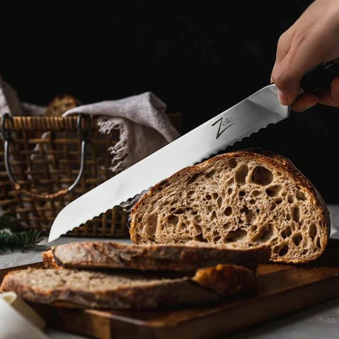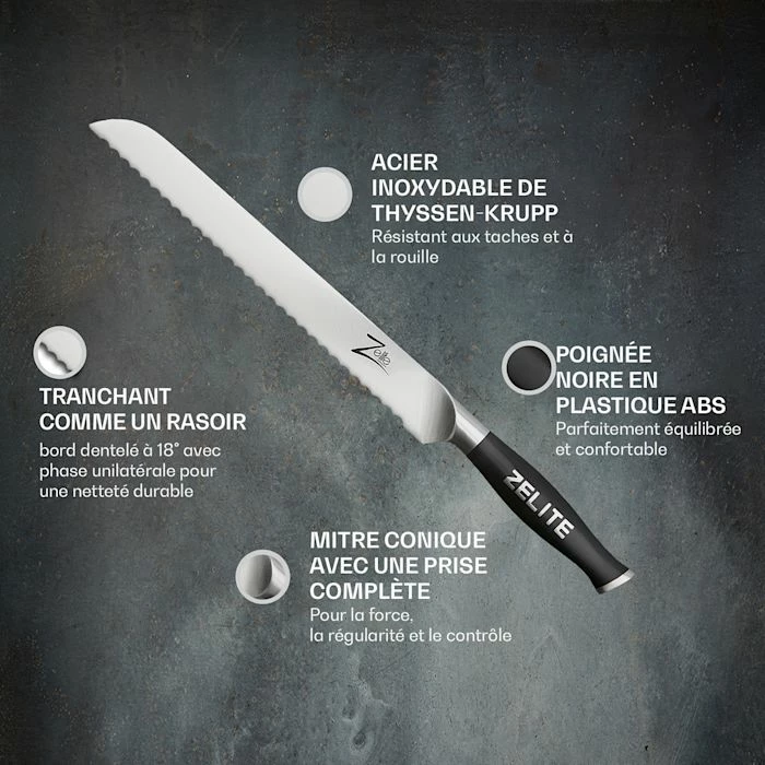 - Lame de 10″ : Couteau à pain pour couper facilement le pain et les produits de boulangerie