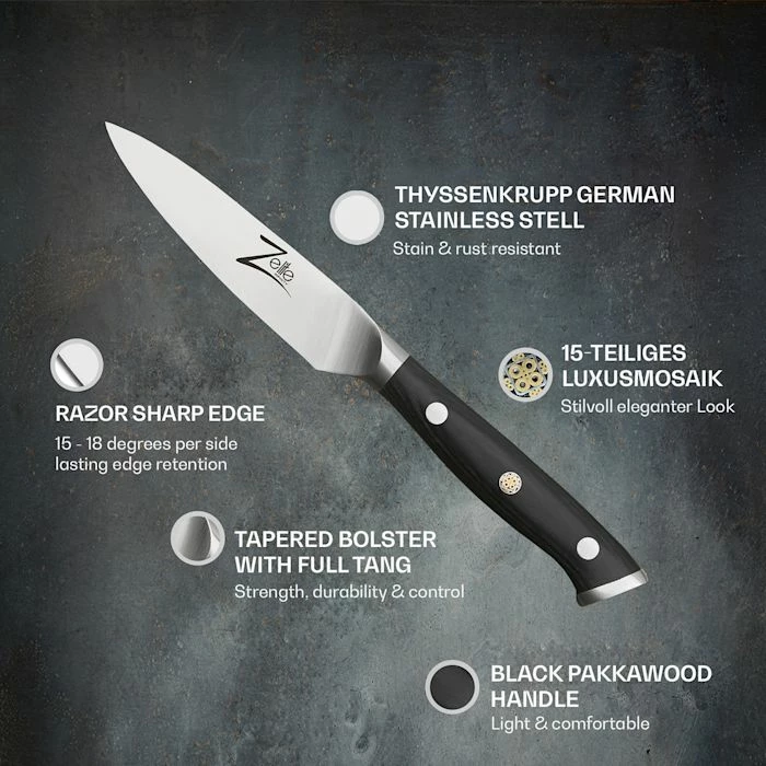 De bons couteaux bien tranchants sont indispensables aux chefs professionnels et à tous ceux qui aiment mettre la main à la pâte dans leur propre cuisine. Notre série de couteaux Alpha-Royal German de Zelite Infinity by Klarstein combine des matériaux de haute qualité, une finition parfaite et un design élégant pour créer des outils de précision qui vous inspireront au quotidien dans votre cuisine.