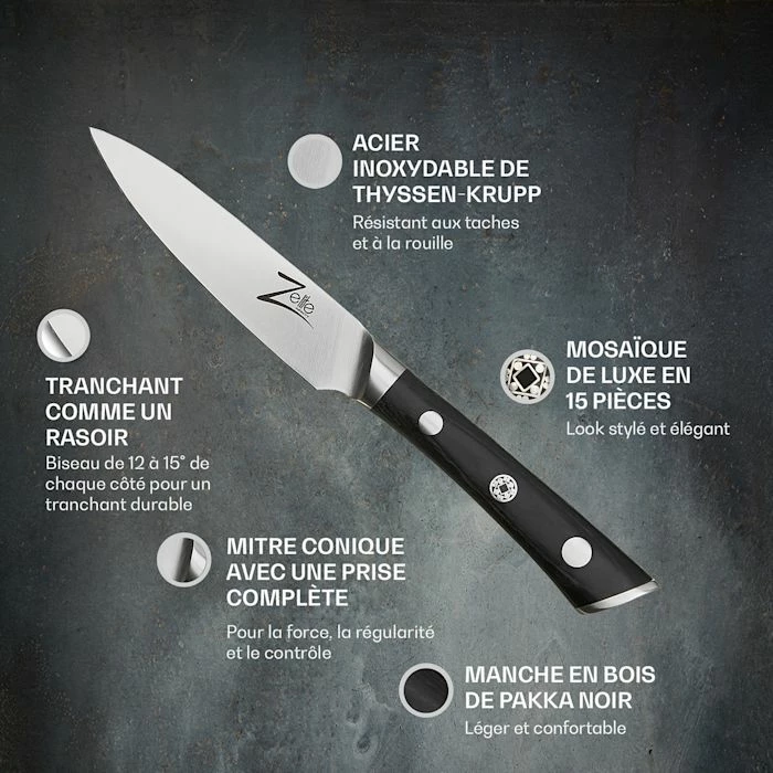 - Bonne prise en main : avec un manche en bois de Pakka noir