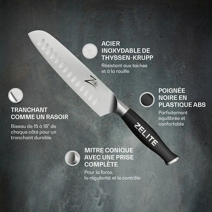 - Lame de 7″ : Couteau Santoku pour des coupes et des hachages particulièrement fins