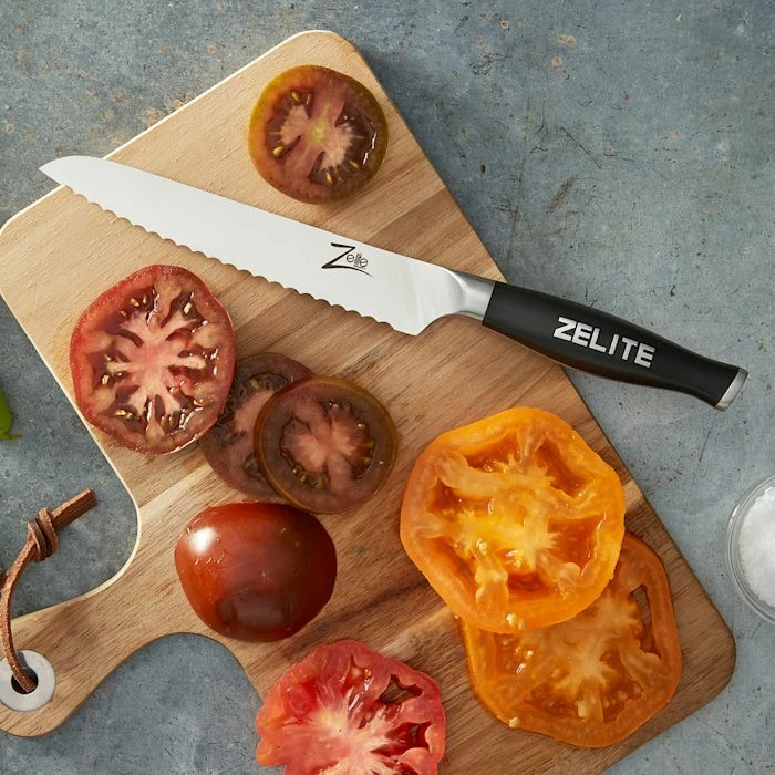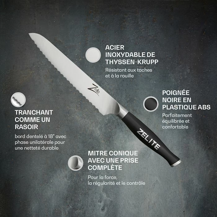 Les couteaux parfaits pour les chefs amateurs, les cuisiniers professionnels et tous ceux qui aiment les couteaux qui coupent ! La gamme de couteaux Zelite Infinity de Klarstein Comfort Pro associe un tranchant extrême, une qualité supérieure et une manipulation facile à un look élégant et permet de couper, hacher ou éplucher très facilement. Les lames en acier inoxydable de qualité allemande de Thyssenkrupp sont dures, flexibles et tranchantes comme des rasoirs. Grâce à la transition sans arêtes ni joints entre la lame et la mitre ainsi qu’aux manches ergonomiques parfaitement équilibrés, les couteaux tiennent bien en main et permettent des coupes de précision parfaites.